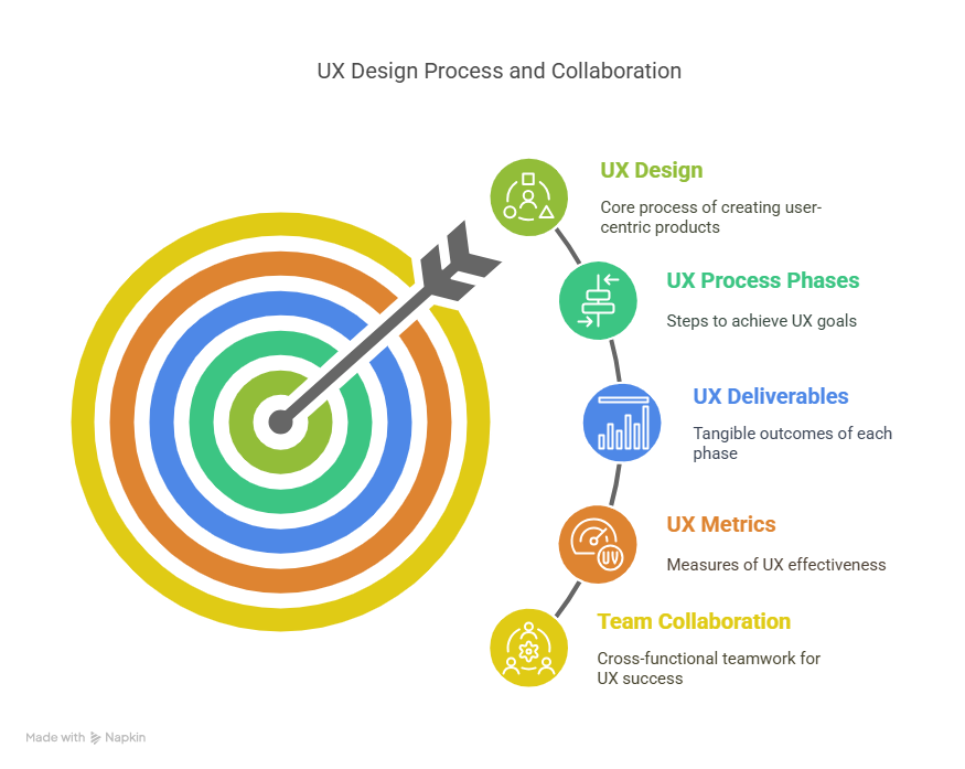 UX (User Experience) design focuses on the functionality, structure, and flow of a product. It ensures that users can navigate smoothly, accomplish tasks easily, and enjoy a frictionless journey. This includes user research, wireframes, prototypes, and iterative testing.