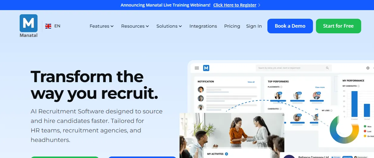 Manatal is an AI-powered recruitment software designed for HR teams and agencies. It offers customizable workflows, branding options, and tools for both temporary and permanent placements. The platform provides AI-driven candidate sourcing and matching capabilities, suitable for businesses of various sizes.